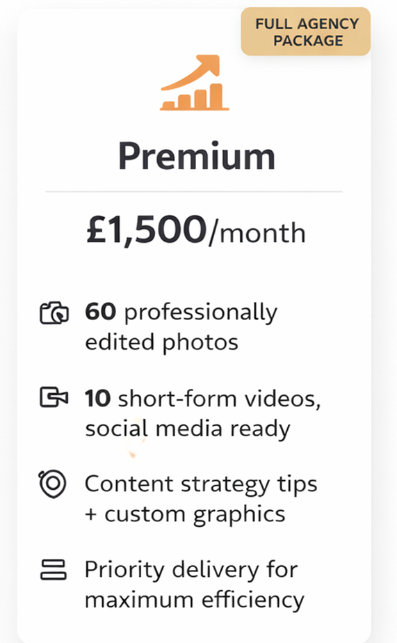 Premium Package: 60 photos + 10 short-form videos, content strategy tips, priority delivery